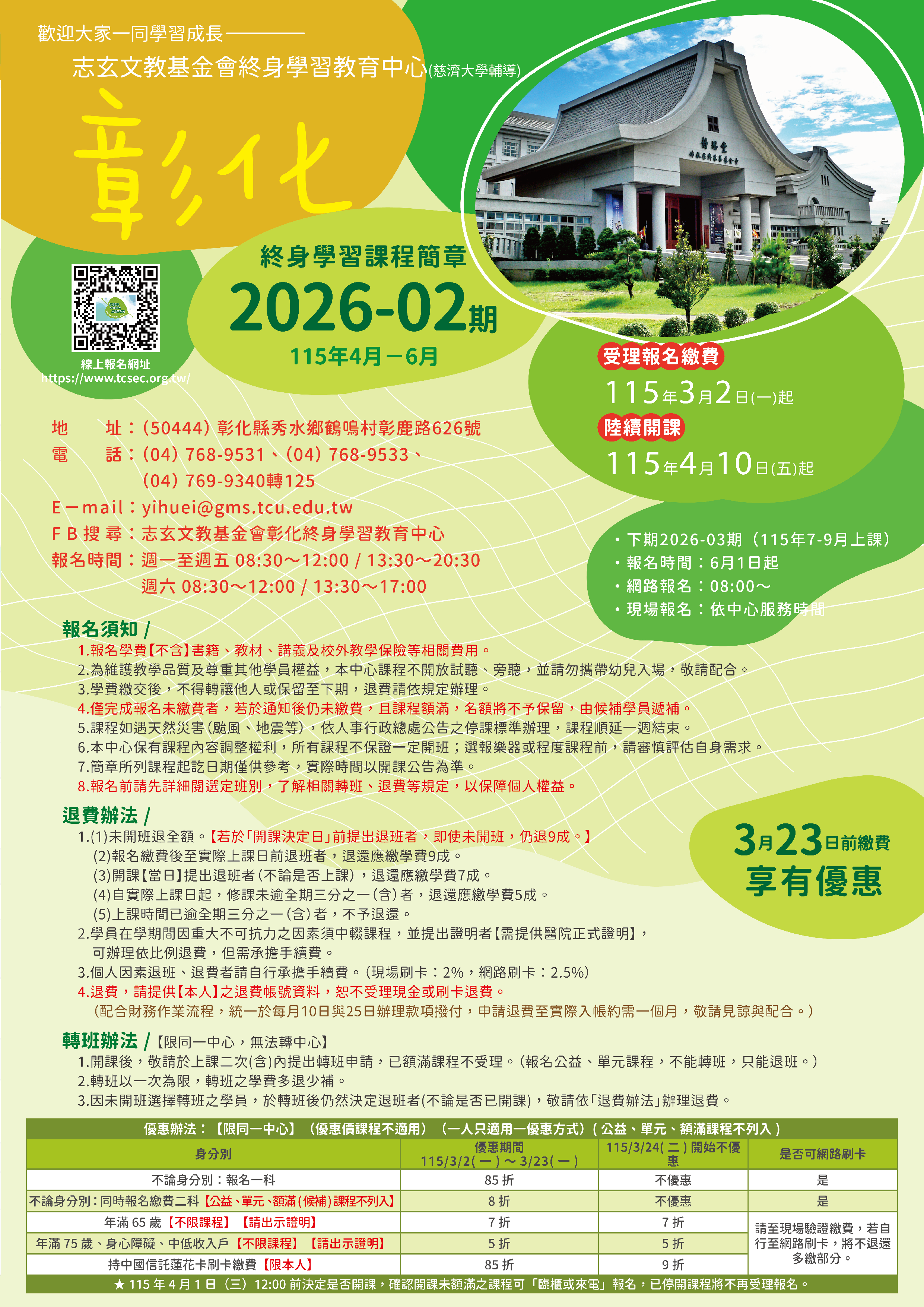 | 53 | CH1152-0414 | 長青班【超值課程】 | 星期三 | 08:30 -15:00 | 招生中 | 04/15 | 102教室 |