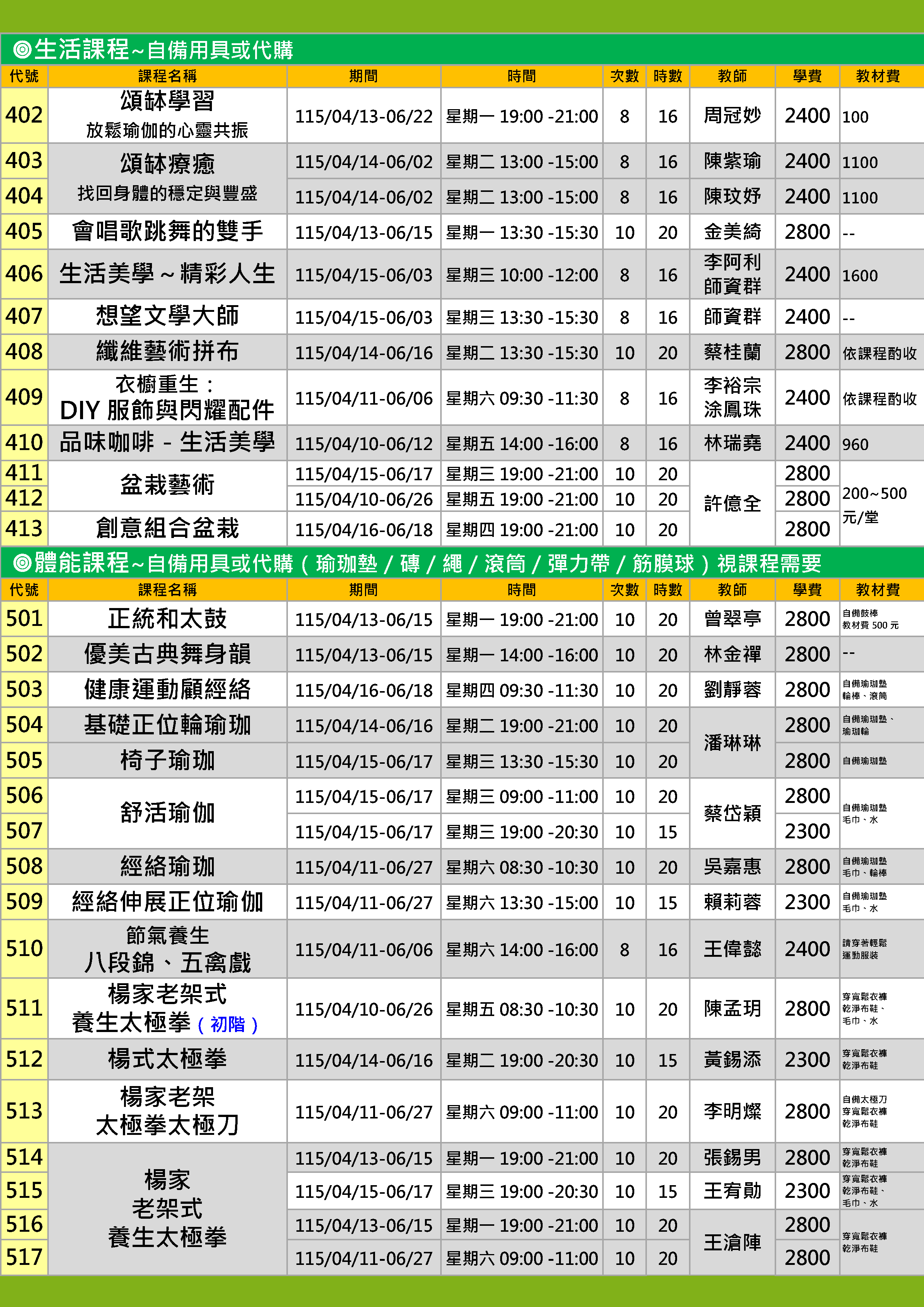 | 69 | CH1152-0515 | 楊家老架式養生太極拳 | 星期三 | 19:00 -20:30 | 招生中 | 04/15 | 清涼地 |
