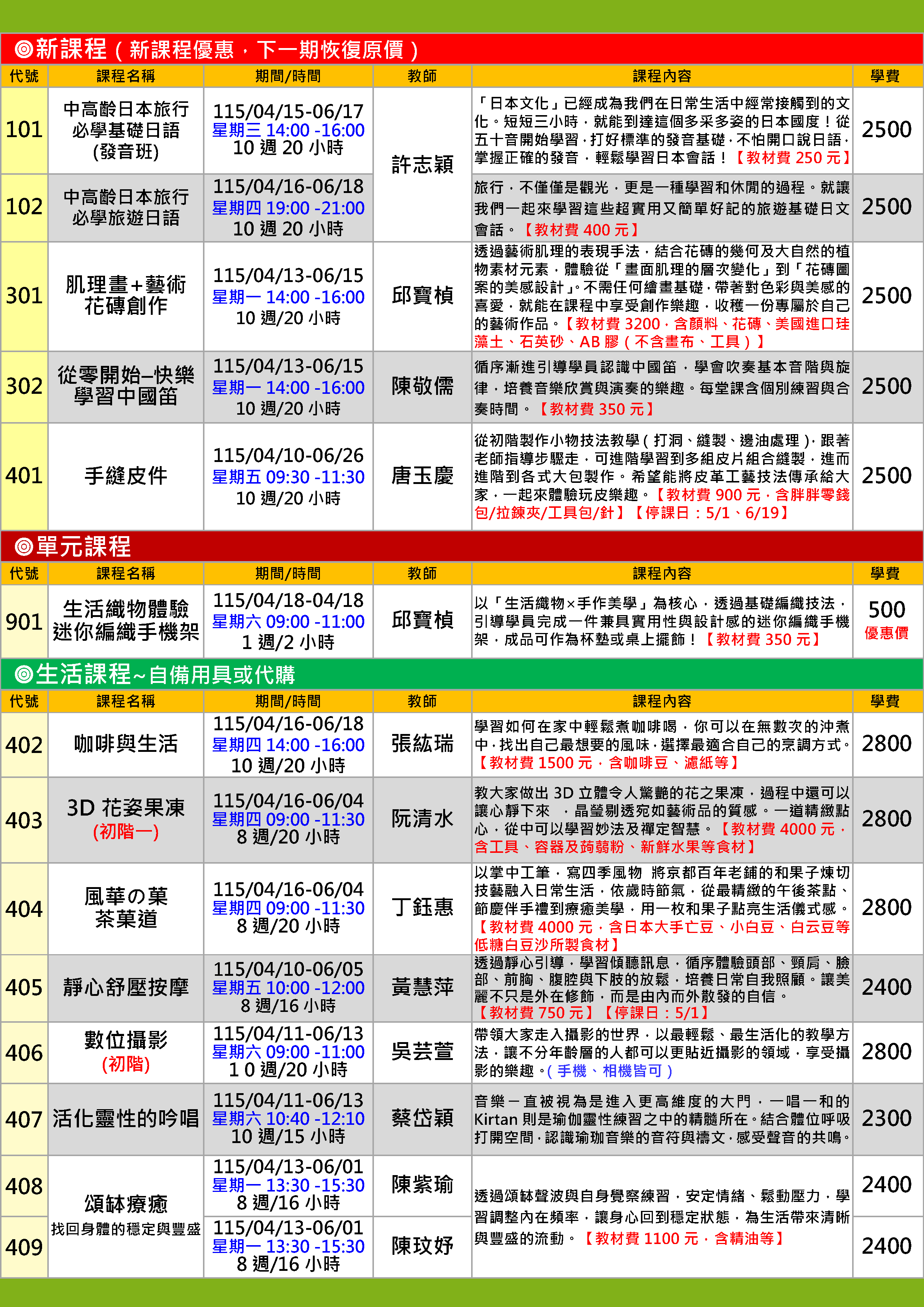 | 31 | CS1152-0401 | 手縫皮件【新課程】 | 星期五 | 09:30 -11:30 | 招生中 | 04/10 | |