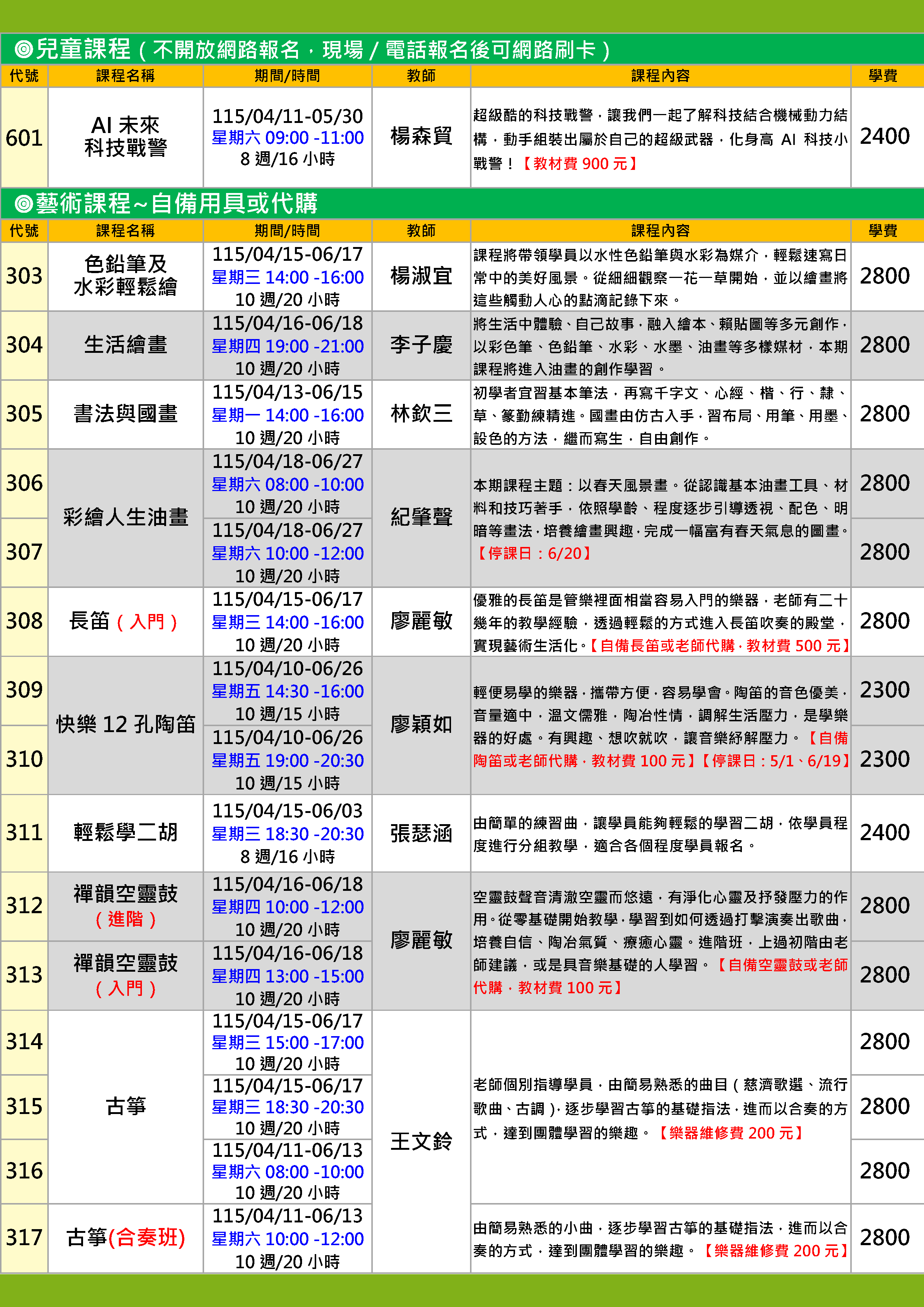 | 28 | CS1152-0315 | 古箏 | 星期三 | 18:30 -20:30 | 招生中 | 04/15 | |