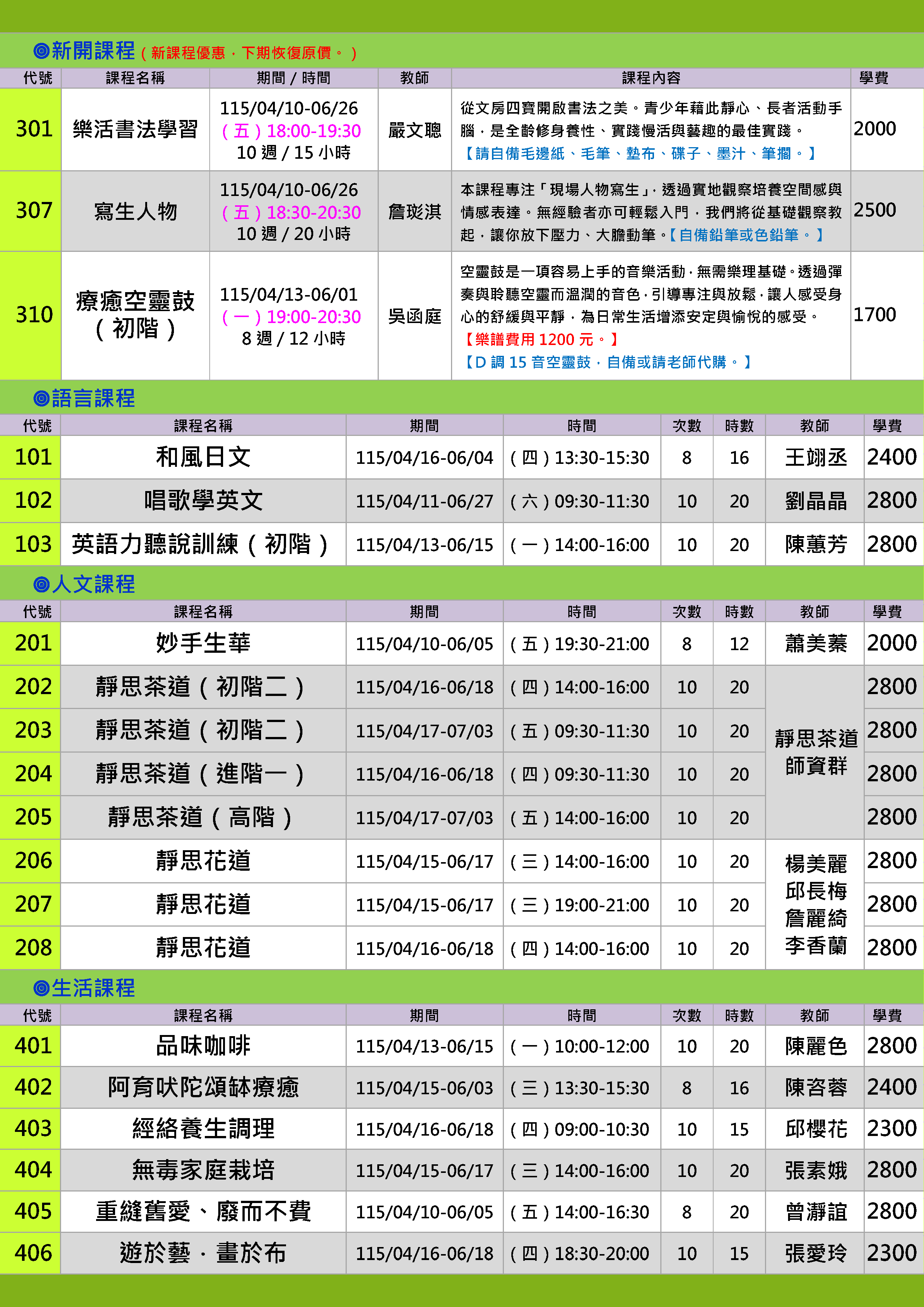 | 24 | CY1152-0311 | 療癒空靈鼓(8+15音) | 星期一 | 13:30 -15:30 | 招生中 | 04/13 | |
