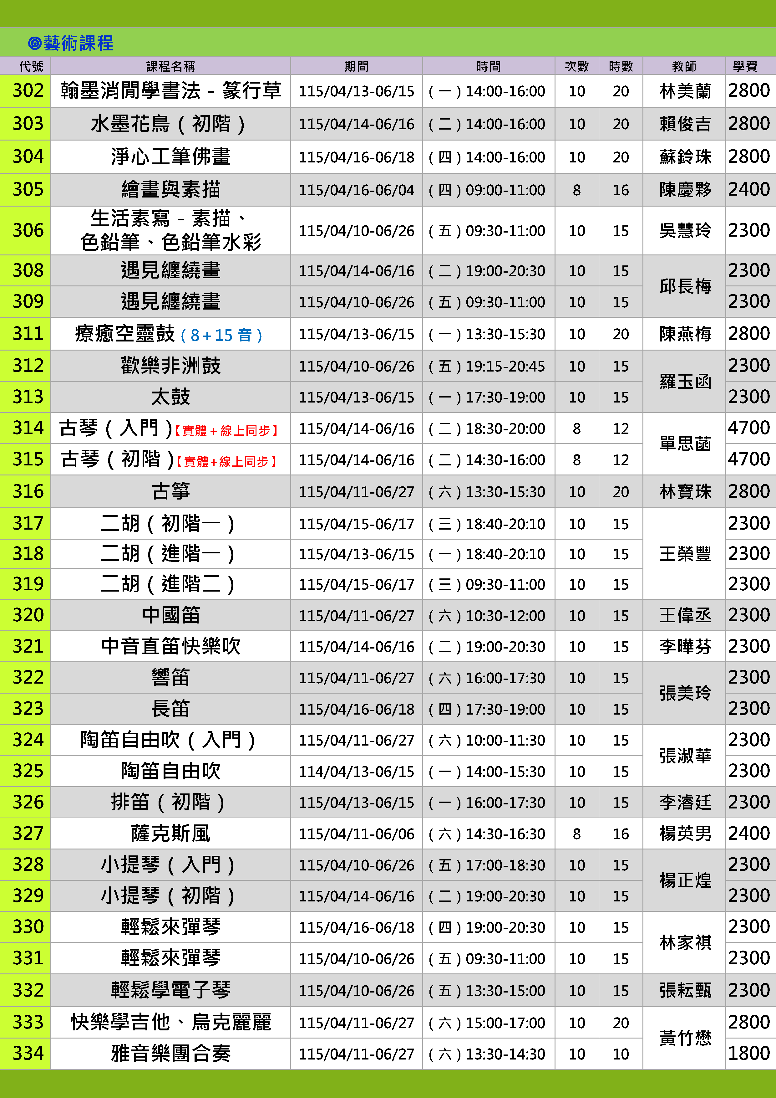 | 47 | CY1152-0334 | 雅音樂團合奏 | 星期六 | 13:30 -14:30 | 招生中 | 04/11 | |