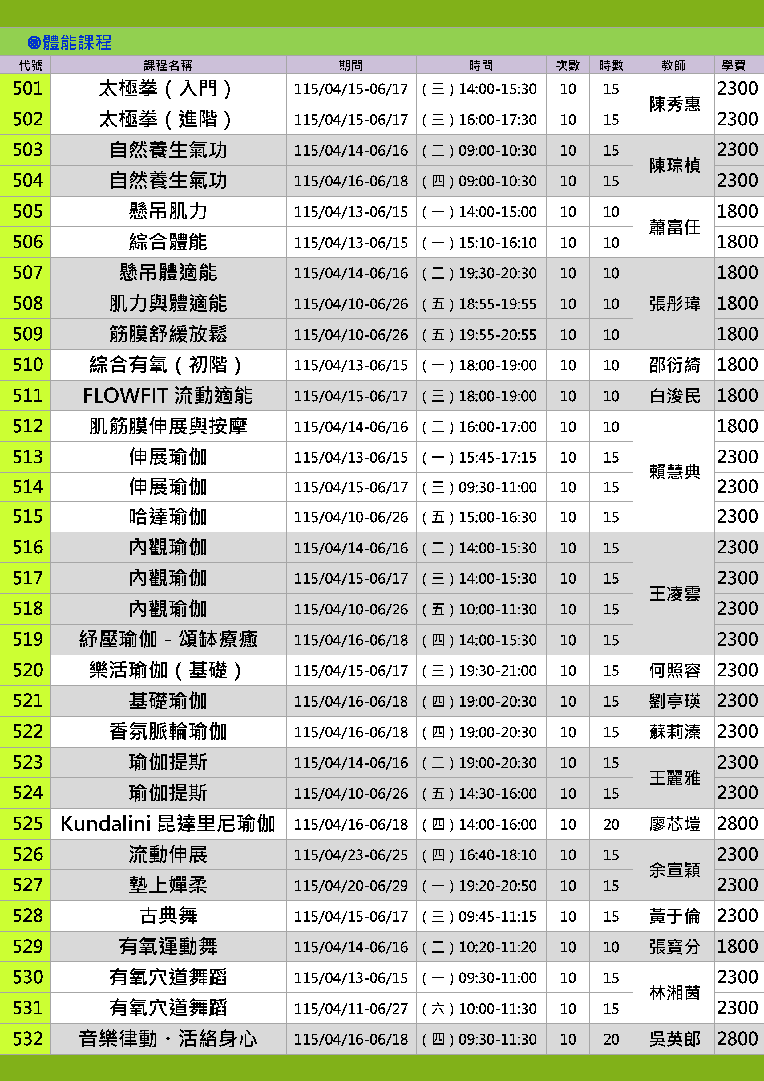 | 78 | CY1152-0525 | Kundalini昆達里尼瑜伽 | 星期四 | 14:00 -16:00 | 招生中 | 04/16 | |