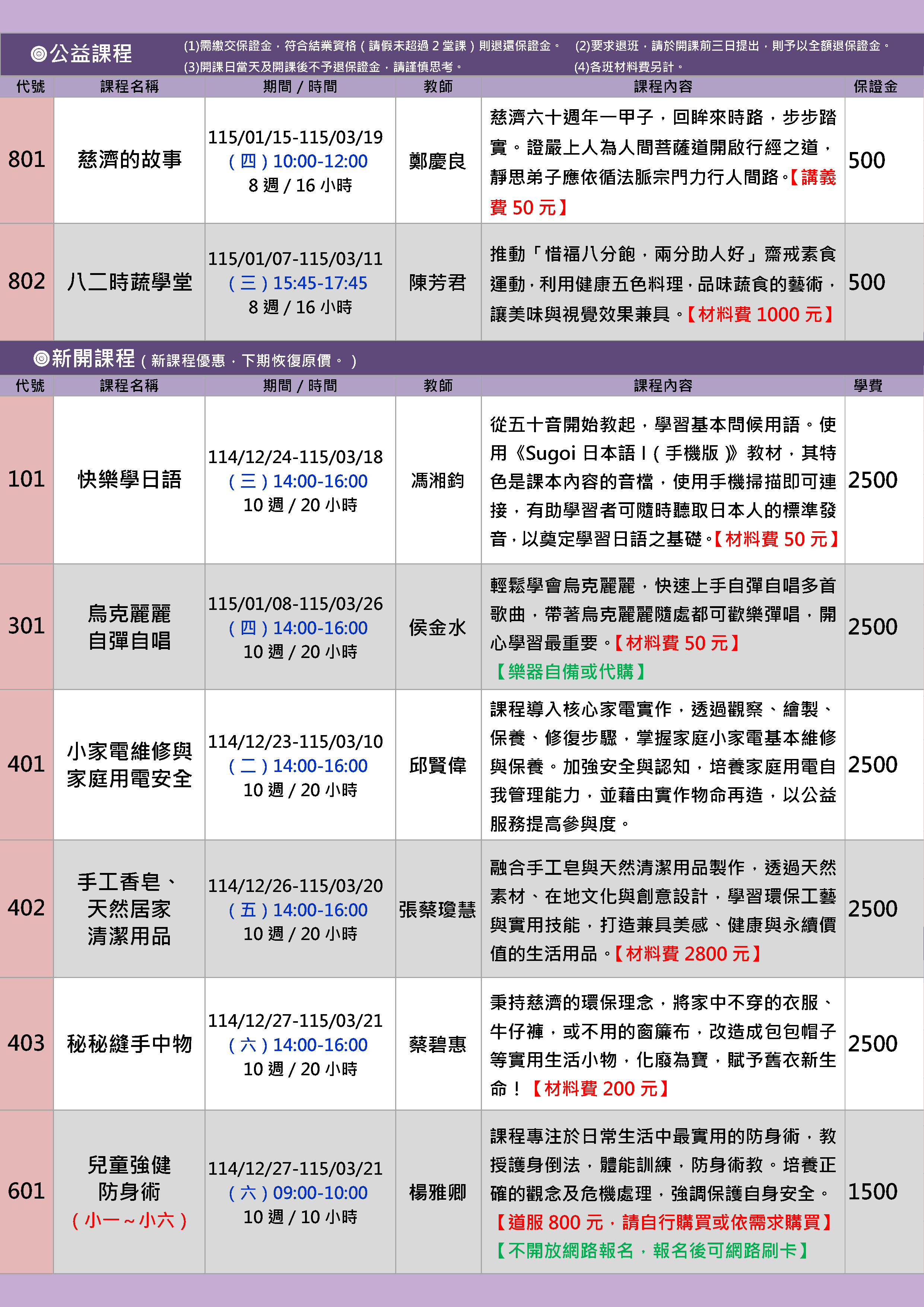 | 23 | FS1151-0402 | 手工香皂、天然居家清潔用品【新課程】 | 星期五 | 14:00 -16:00 | 開課 | 12/26 | 東302 |