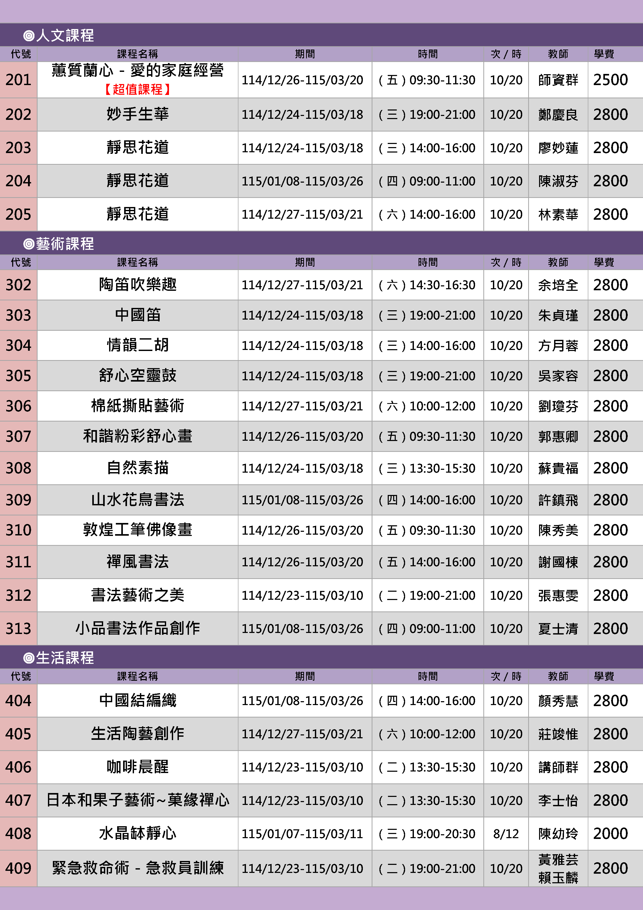 | 4 | FS1151-0201 | 蕙質蘭心-愛的家庭經營【超值課程】 | 星期五 | 09:30 -11:30 | 開課 | 12/26 | 東201 |