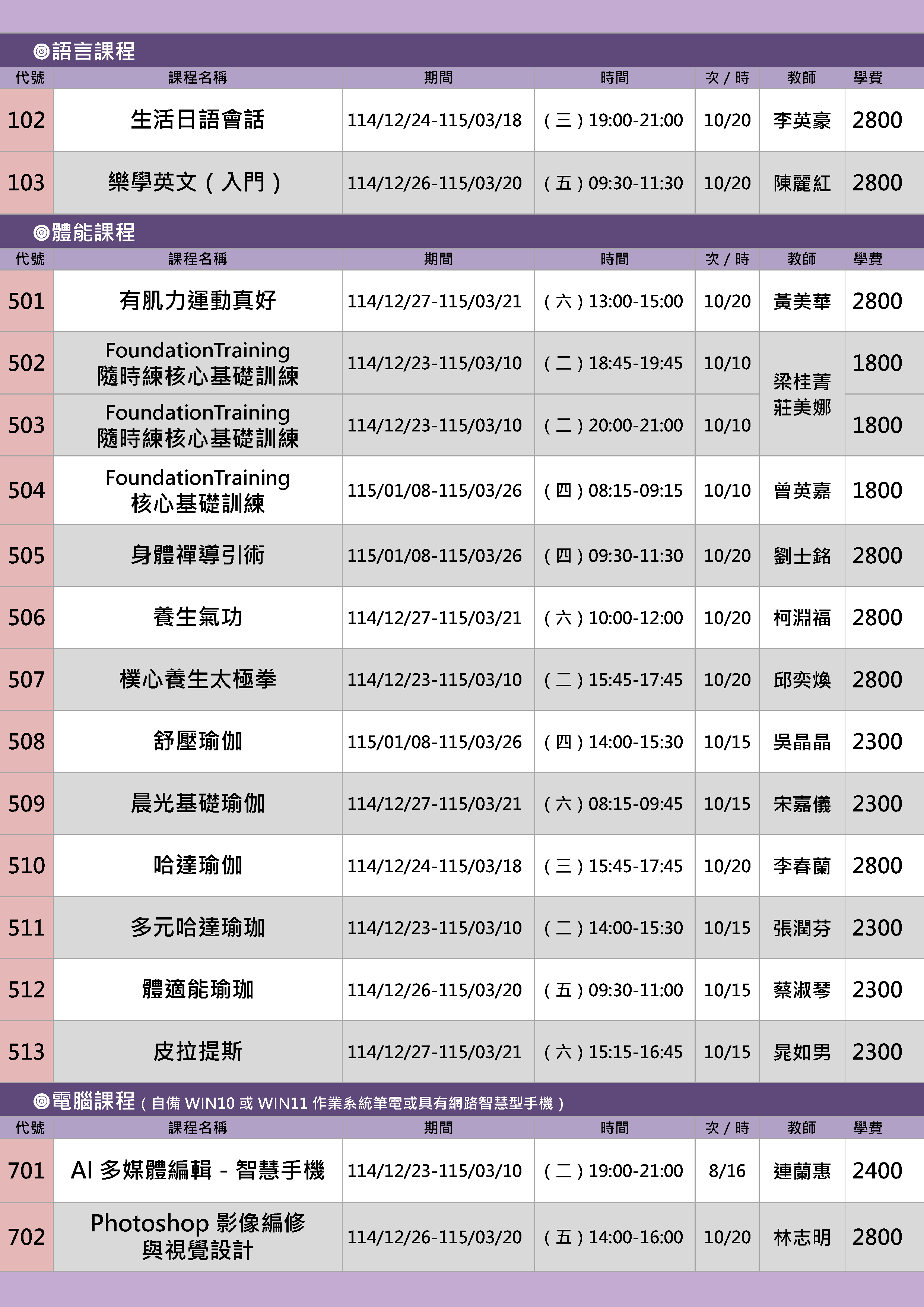 | 39 | FS1151-0509 | 晨光基礎瑜伽 | 星期六 | 08:15 -09:45 | 開課 | 12/27 | 東301 |