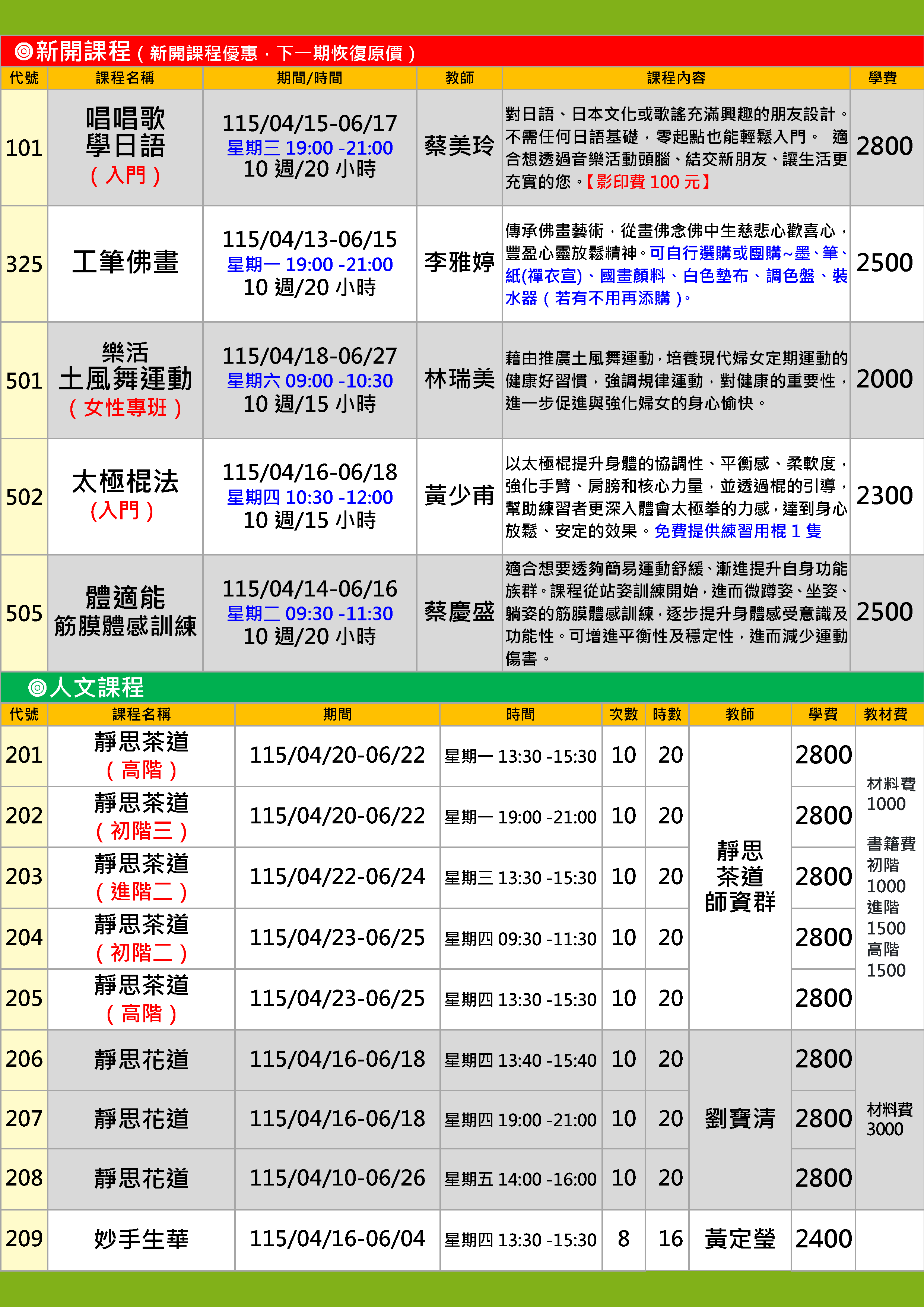 | 40 | FY1152-0502 | 太極棍法入門【新課程】 | 星期四 | 10:30 -12:00 | 招生中 | 04/16 | 302&303教室 |
