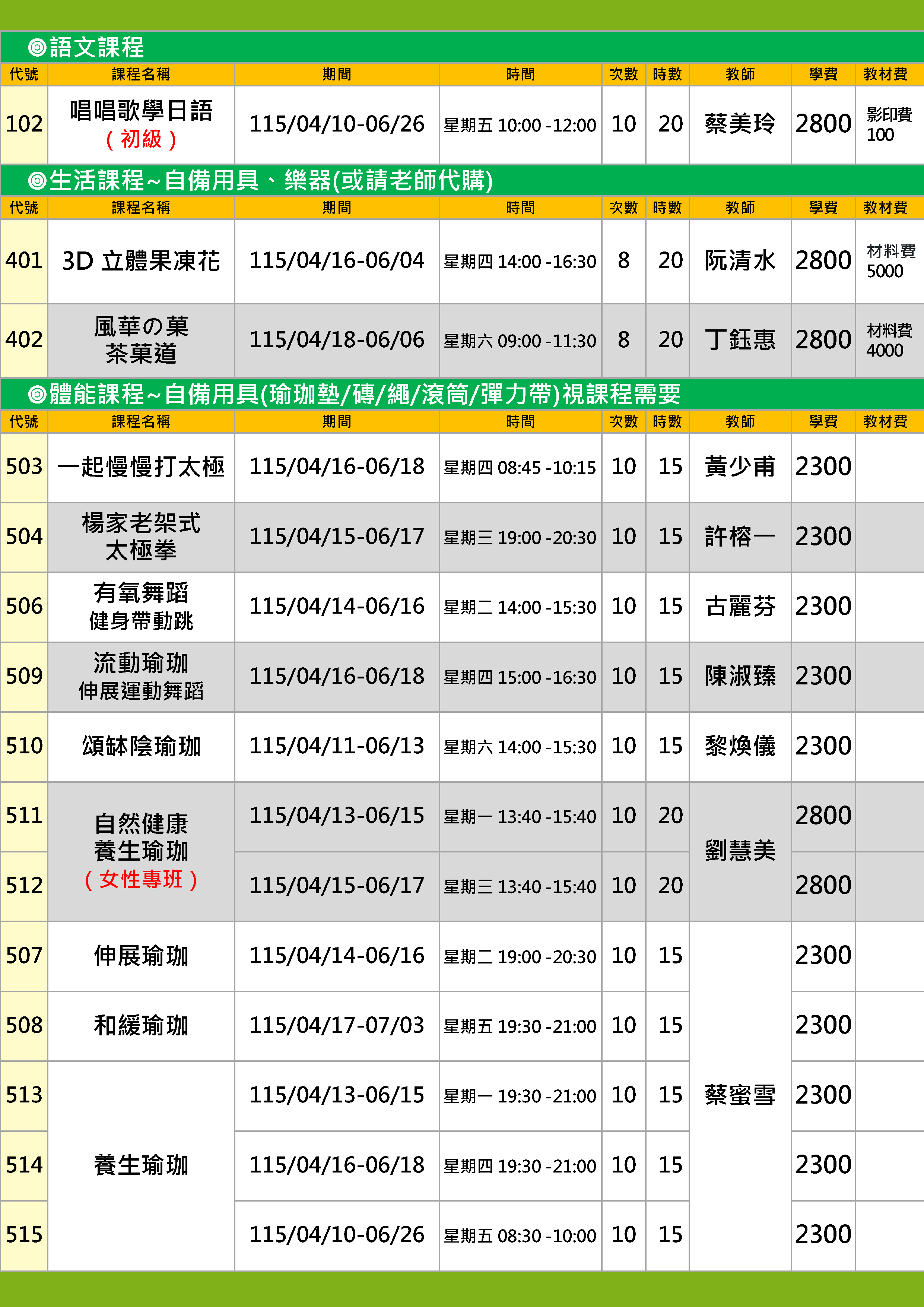 | 50 | FY1152-0512 | 自然健康養生瑜珈(女性專班) | 星期三 | 13:40 -15:40 | 招生中 | 04/15 | 302&303教室 |