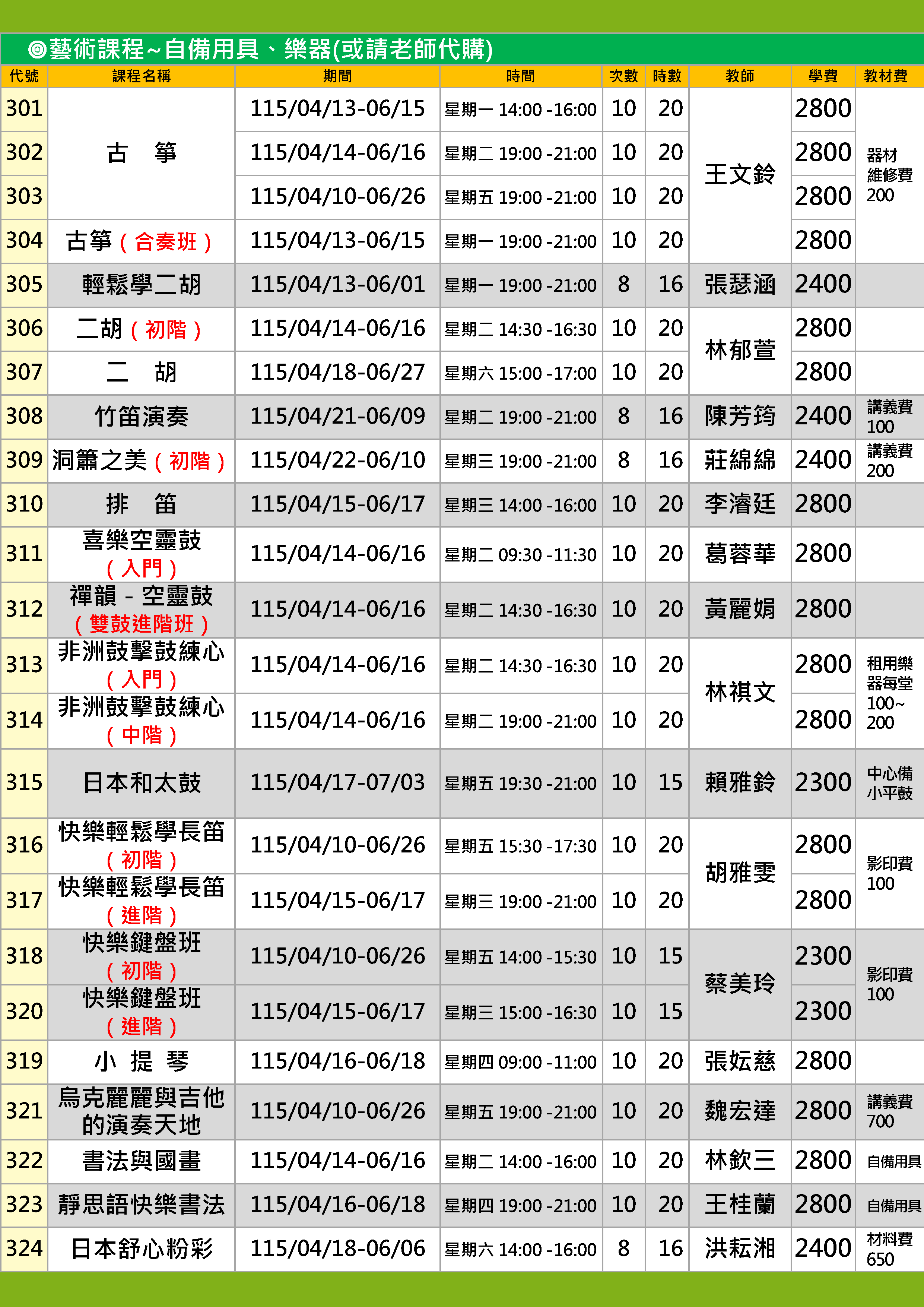 | 13 | FY1152-0302 | 古箏 | 星期二 | 19:00 -21:00 | 招生中 | 04/14 | 301教室 |