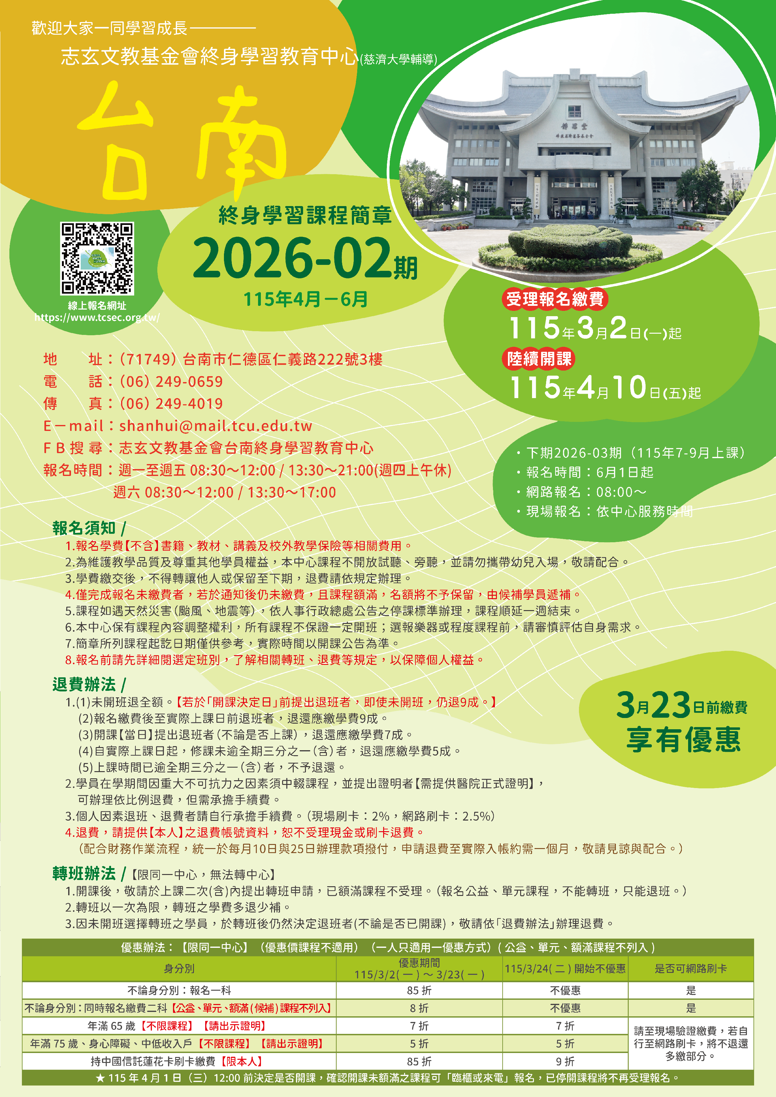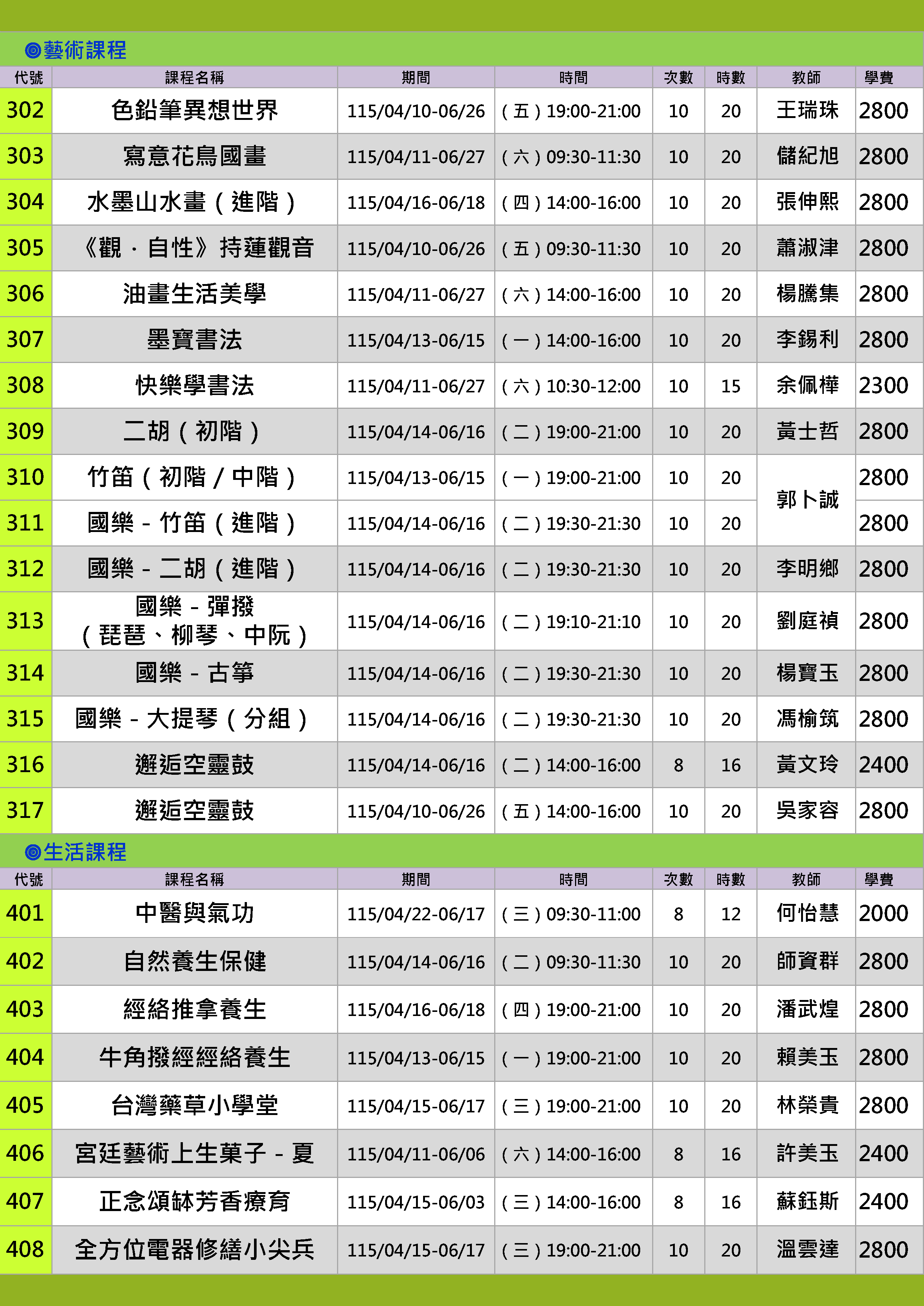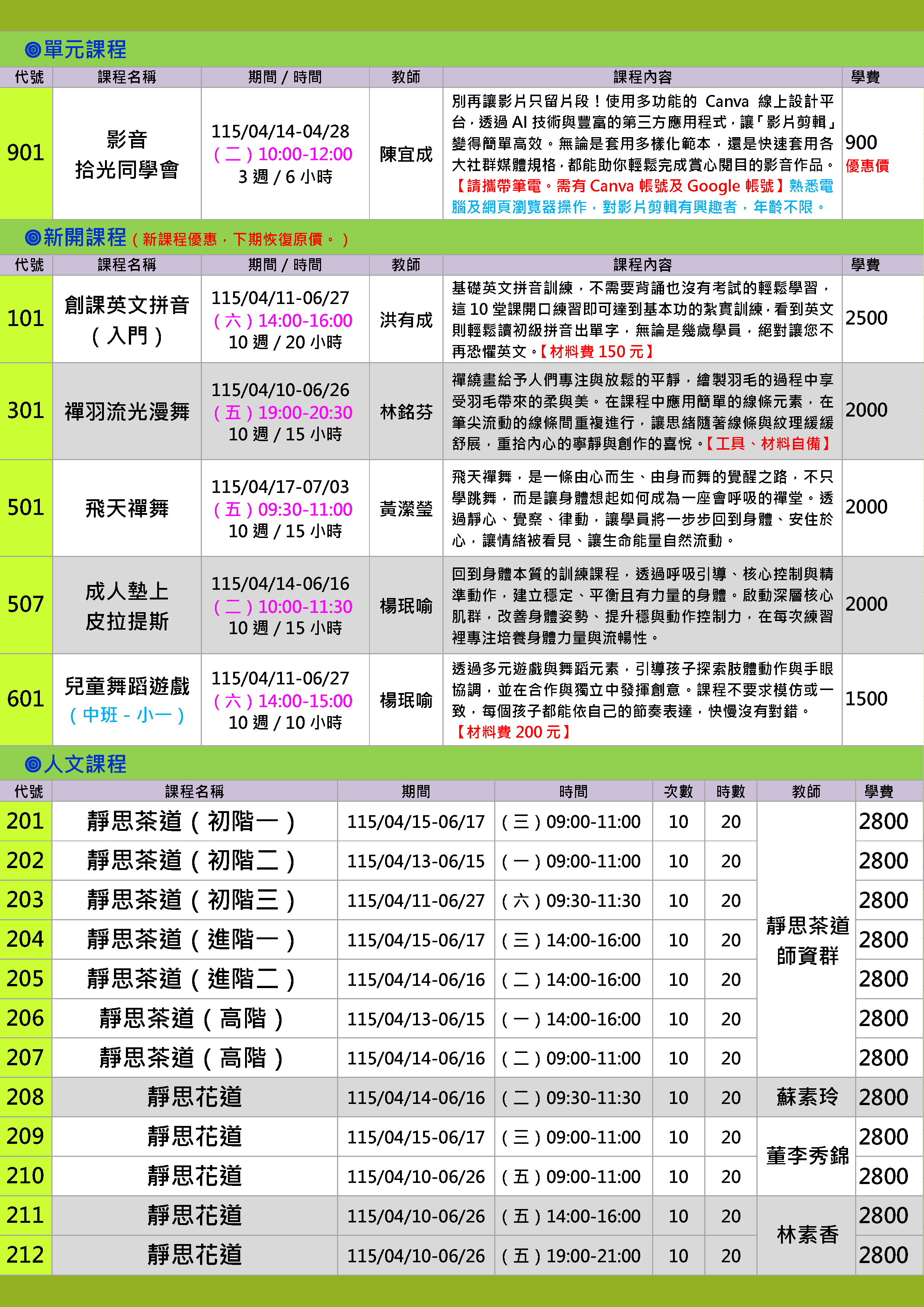 | 35 | TN1152-0405 | 台灣藥草小學堂 | 星期三 | 19:00 -21:00 | 招生中 | 04/15 | |