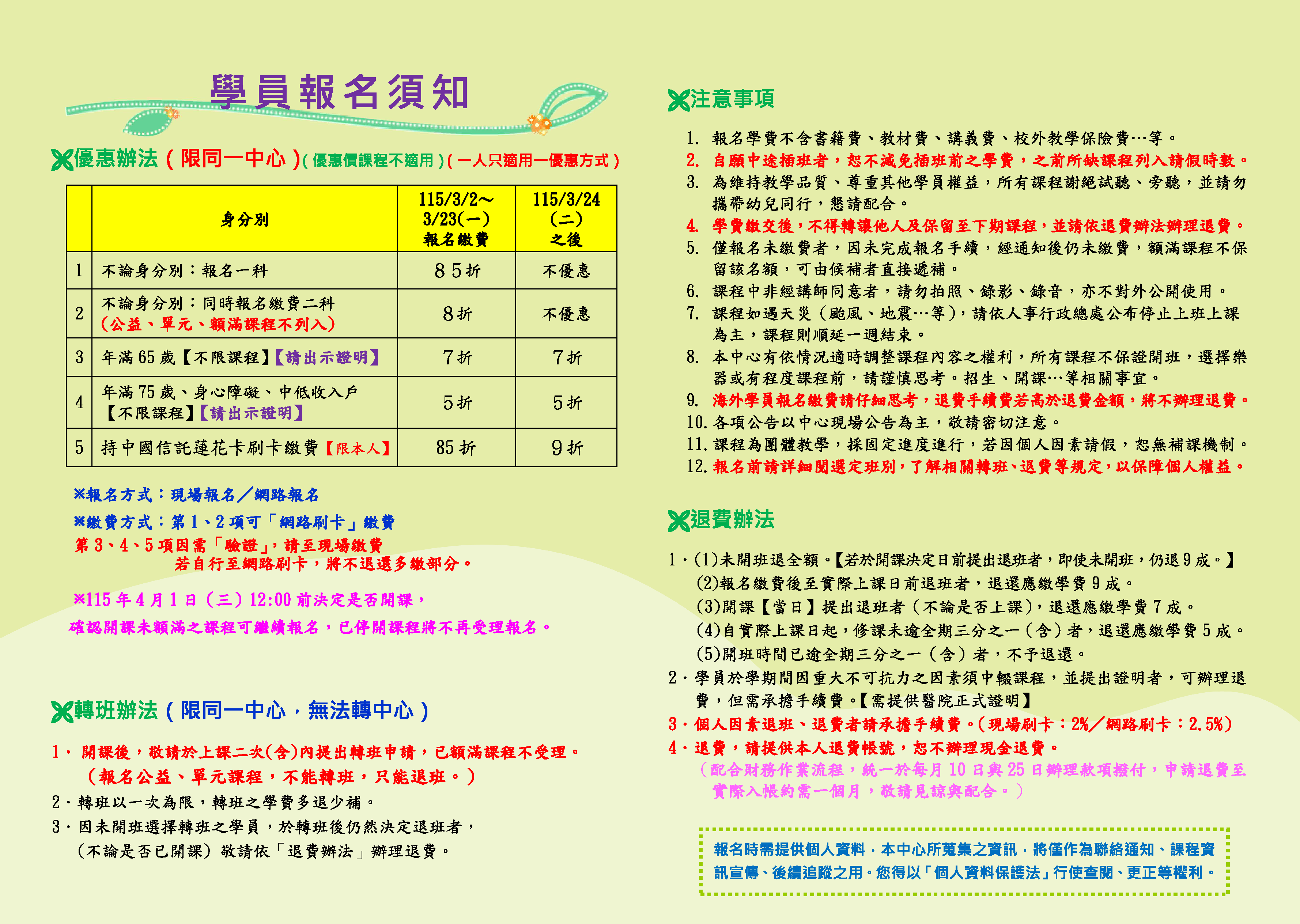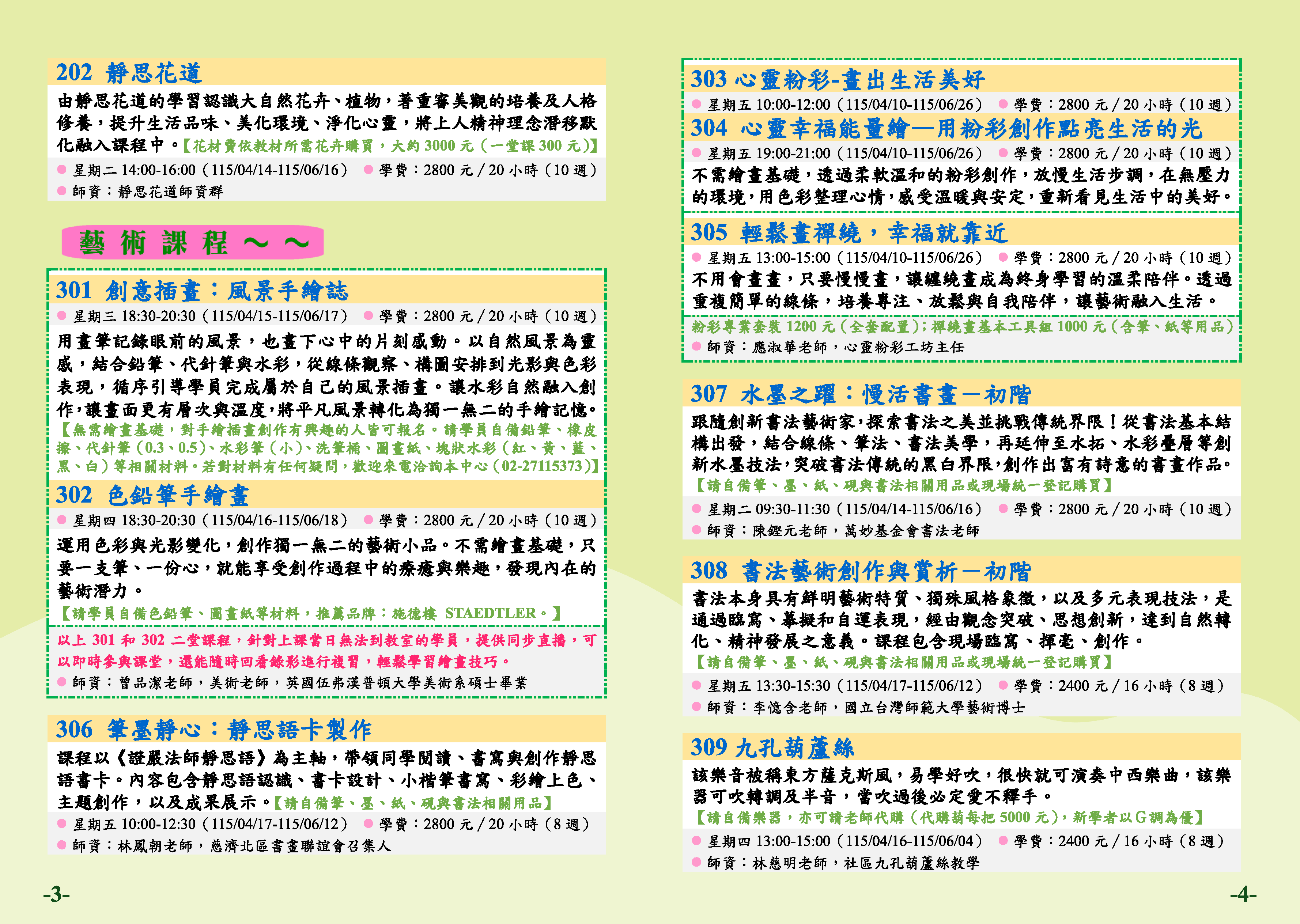 | 12 | TP1152-0304 | 心靈粉彩-讓生活亮起來 | 星期五 | 19:00 -21:00 | 招生中 | 04/10 | 三樓知足教室 |