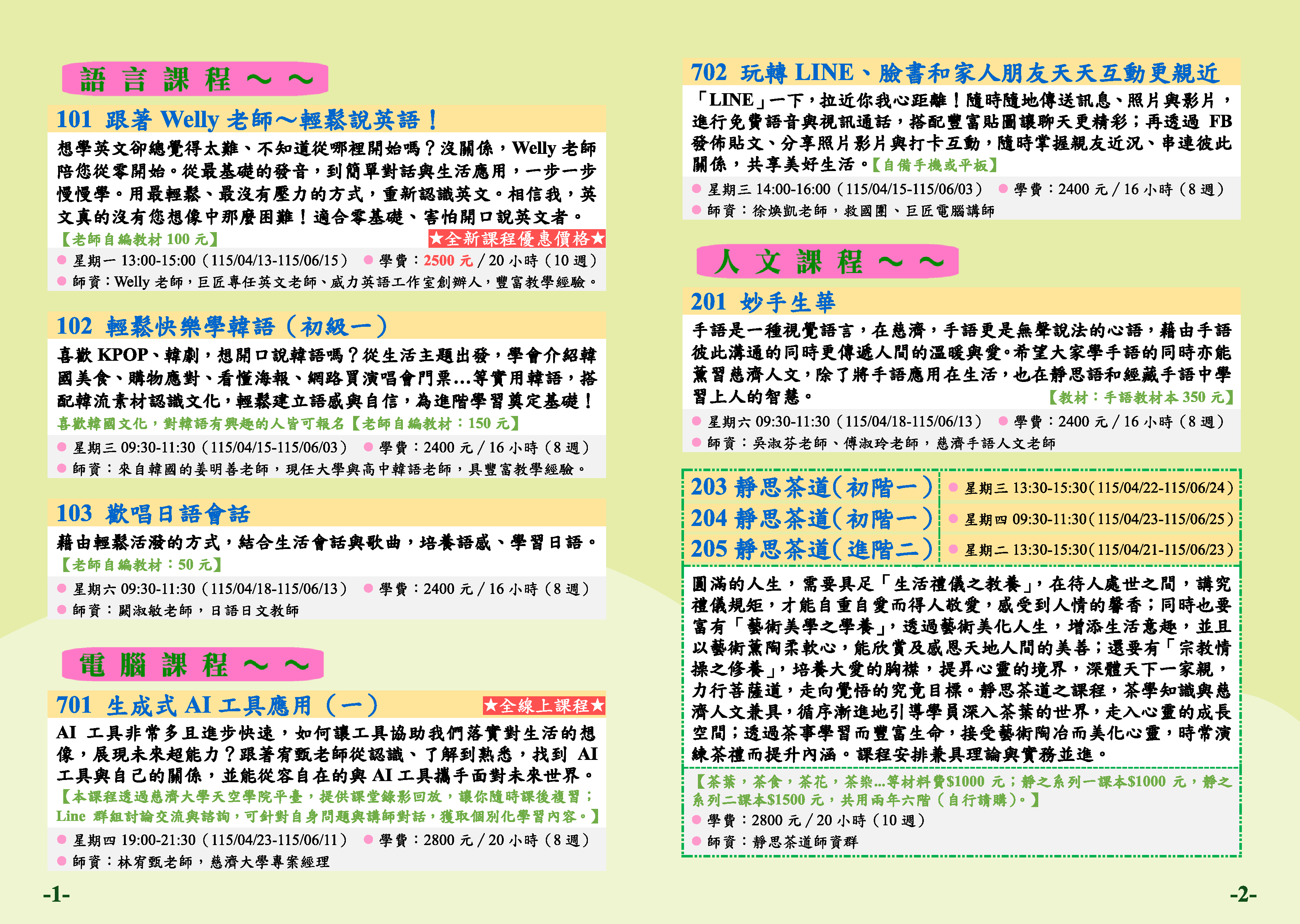 | 2 | TP1152-0102 | 輕鬆快樂學韓語(初級一) | 星期三 | 09:30 -11:30 | 招生中 | 04/15 | 三樓知足教室 |
