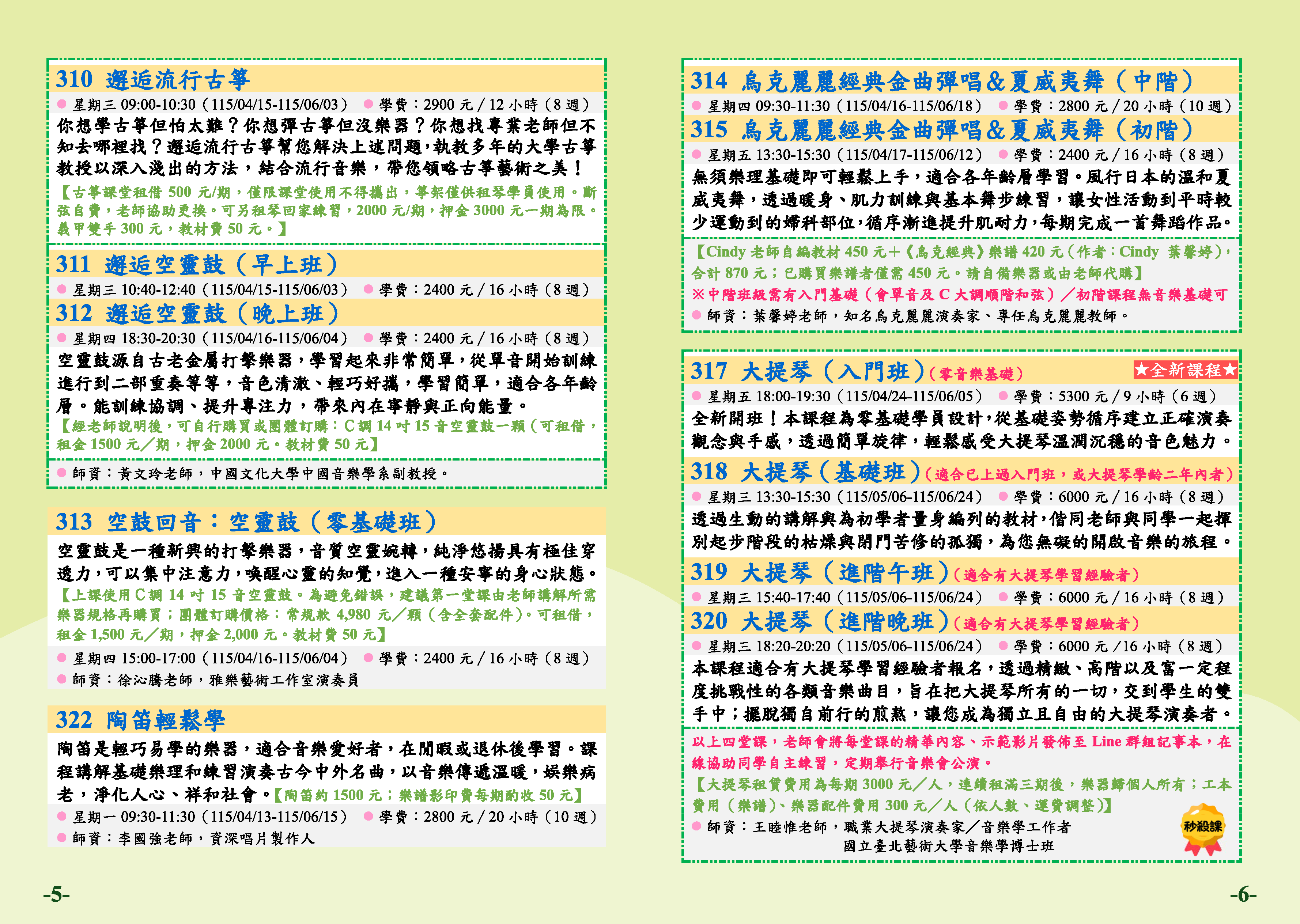 | 18 | TP1152-0310 | 邂逅流行古箏 | 星期三 | 09:00 -10:30 | 招生中 | 04/15 | 七樓感恩教室 |