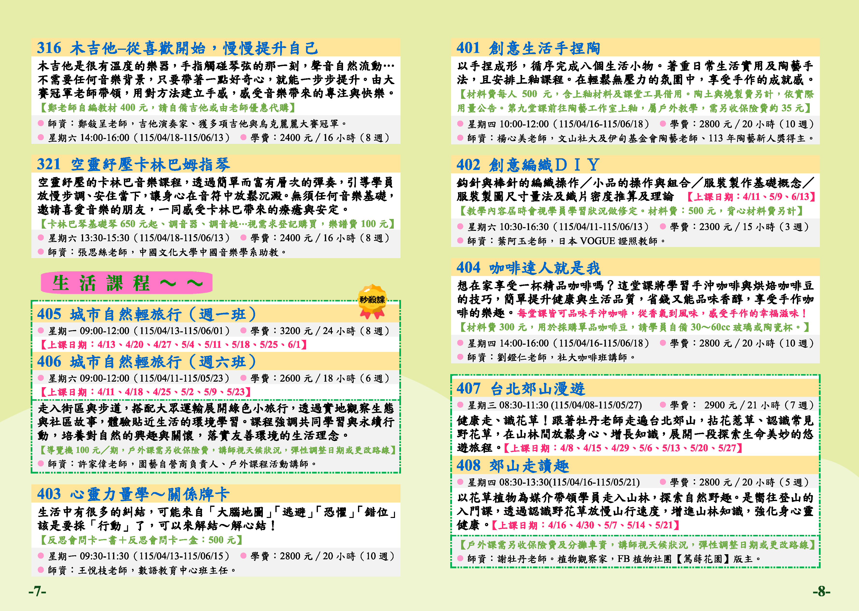 | 37 | TP1152-0407 | 台北郊山漫遊 | 星期三 | 08:30 -11:30 | 招生中 | 04/08 | 戶外課程 |