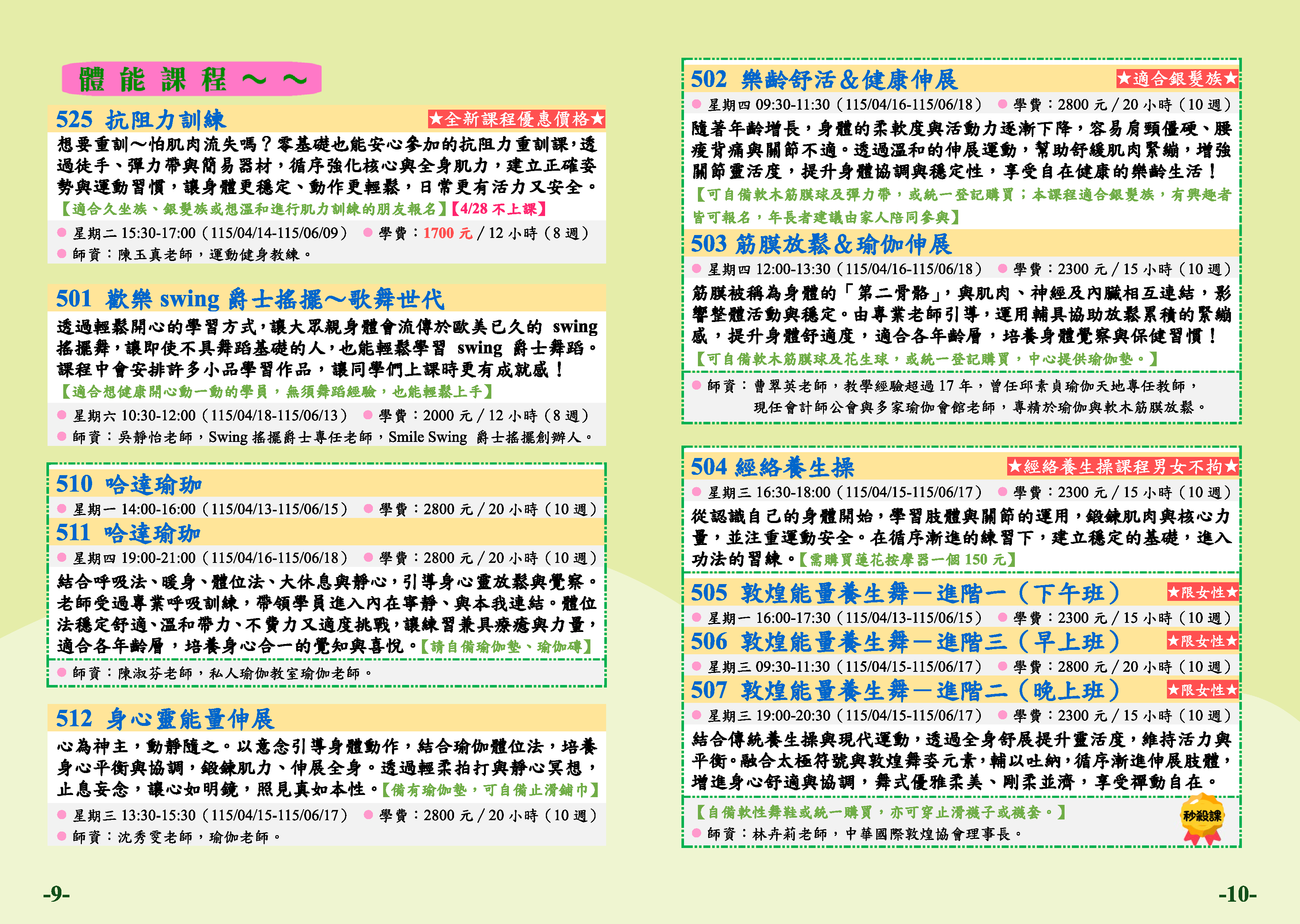 | 44 | TP1152-0506 | 敦煌能量養生舞-進階三(早上班) | 星期三 | 09:30 -11:30 | 招生中 | 04/15 | 四樓善解教室 |