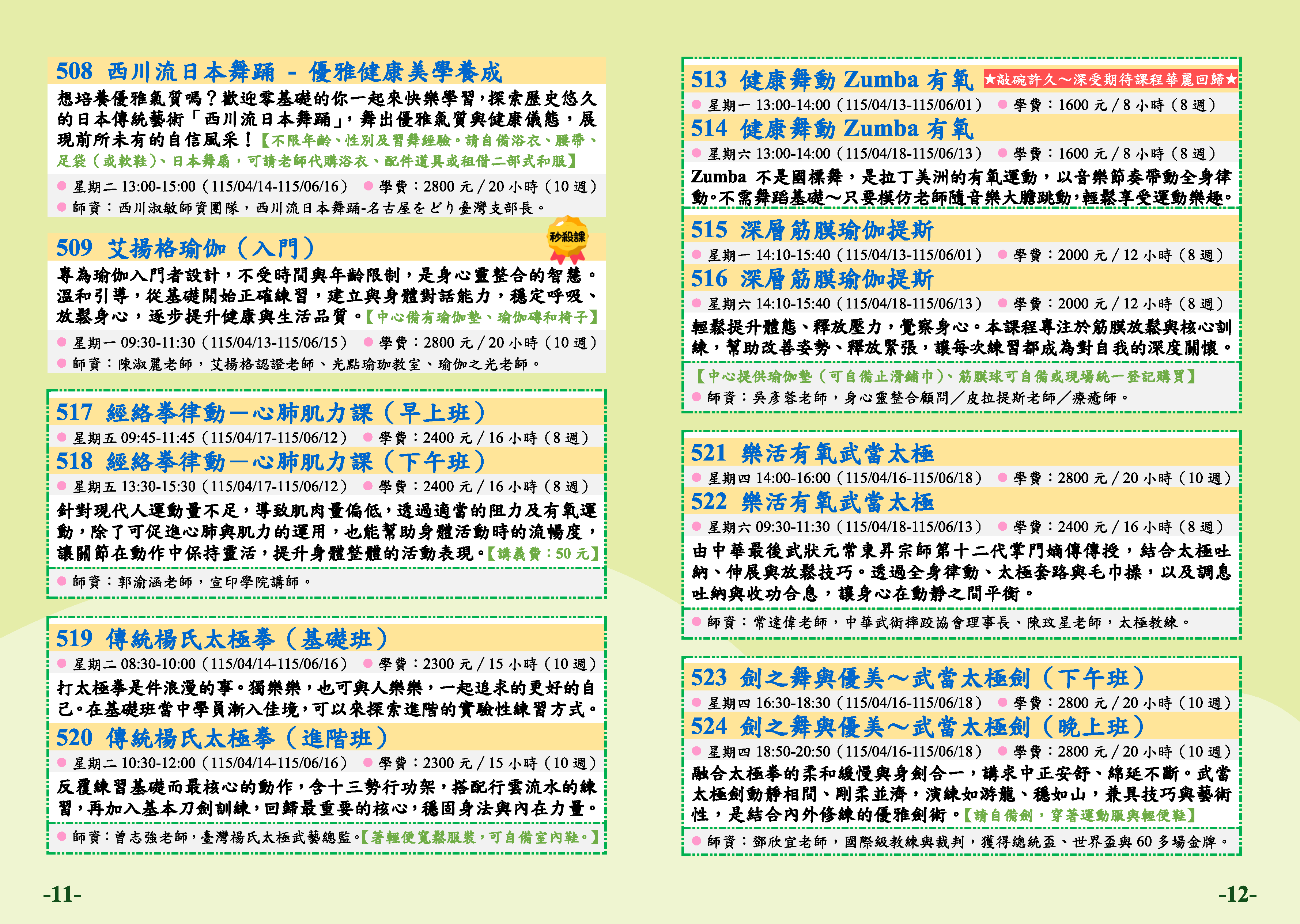 | 62 | TP1152-0524 | 劍之舞與優美~武當太極劍(晚上班) | 星期四 | 18:50 -20:50 | 招生中 | 04/16 | 四樓善解教室 |