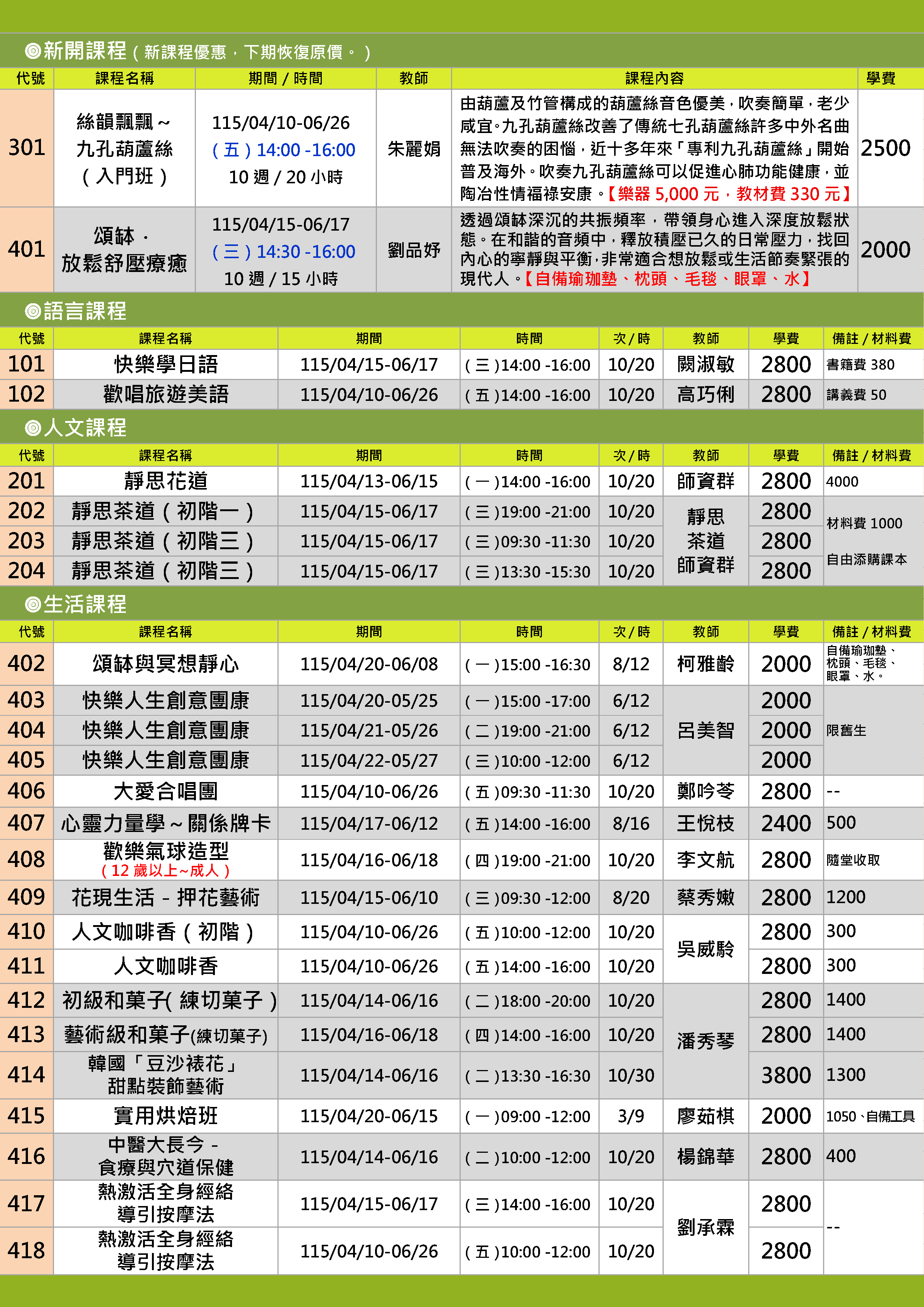 | 27 | ZZ1152-0401 | 頌缽.放鬆舒壓療癒【新課程】 | 星期三 | 14:30 -16:00 | 招生中 | 04/15 | |