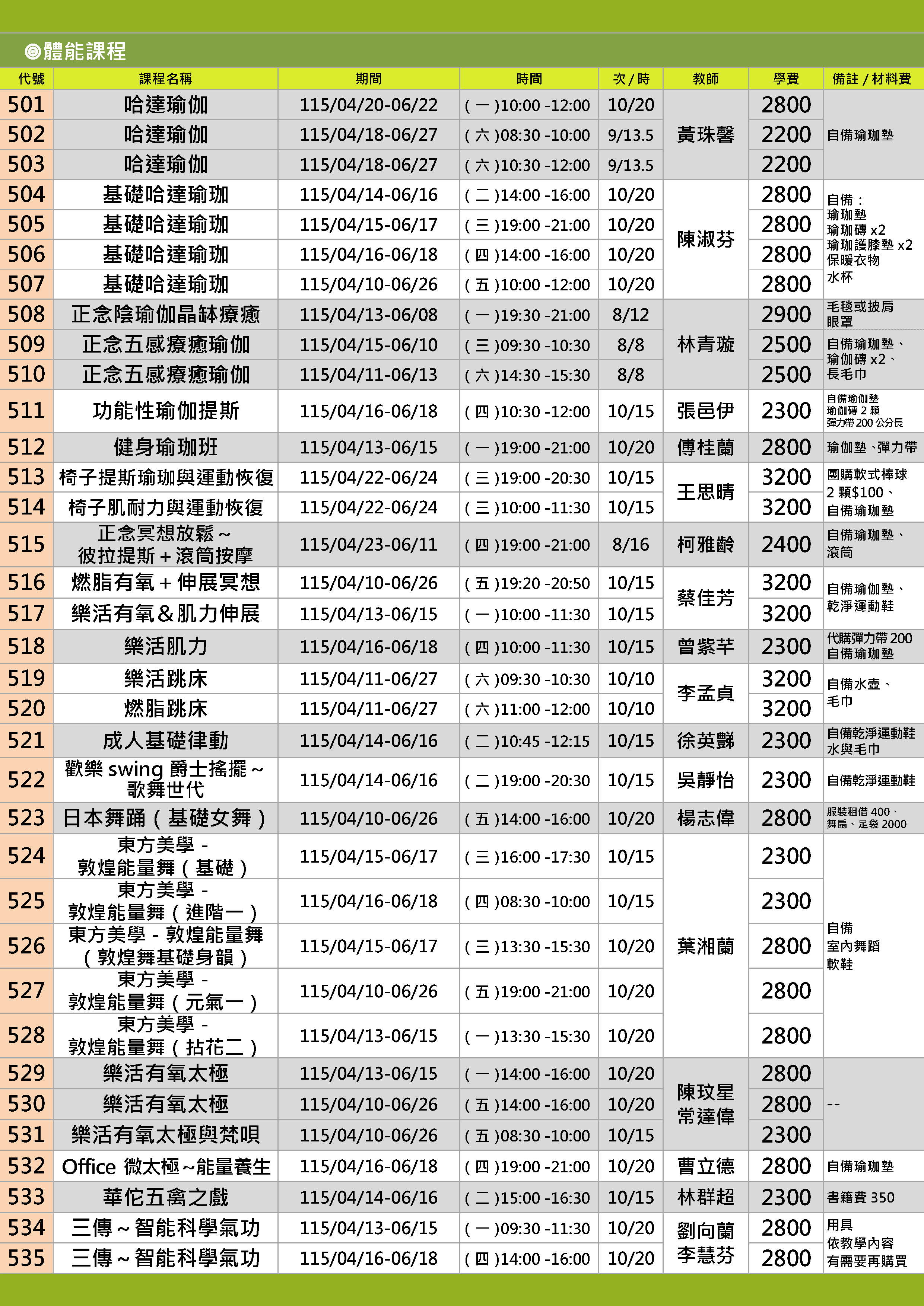 | 56 | ZZ1152-0512 | 健身瑜珈班 | 星期一 | 19:00 -21:00 | 招生中 | 04/13 | |