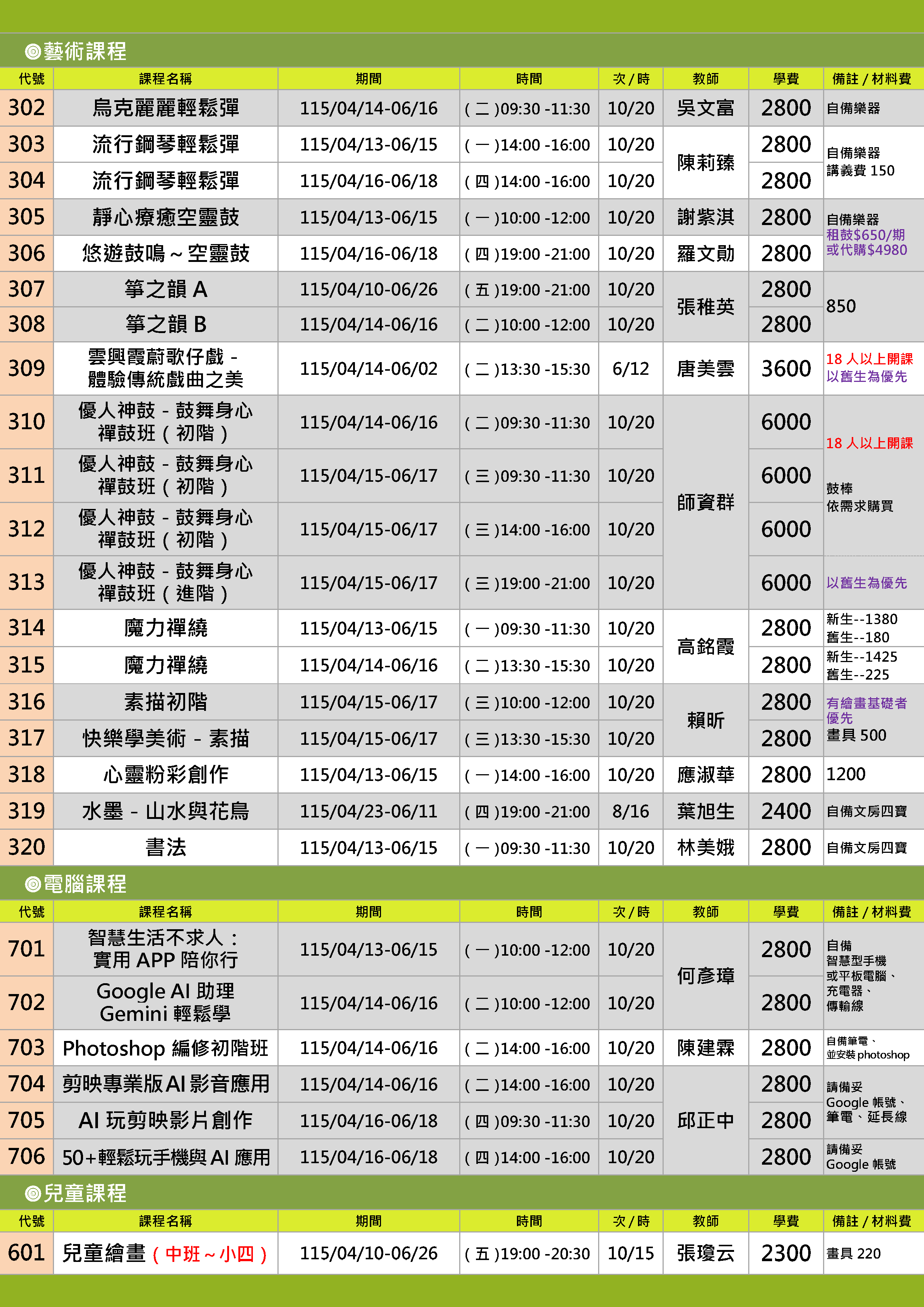 | 19 | ZZ1152-0313 | 優人神鼓-鼓舞身心禪鼓班(進階) | 星期三 | 19:00 -21:00 | 招生中 | 04/15 | |